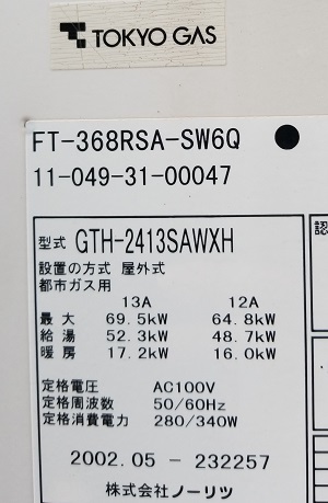 交換前の給湯器は、ノーリツのガス温水暖房付ふろ給湯器、GTH-2413SAWXHです。